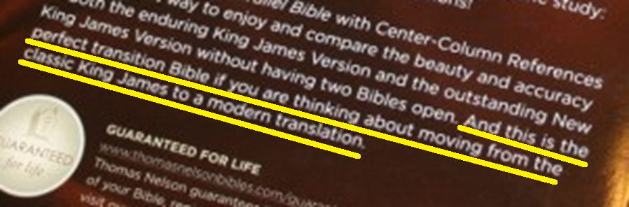 Thomas Nelson (owned by Harper Collins who also publishes the satanic bible and sodomite pornography) admits on the back cover of its KJV/NKJV that the NKJV is the “perfect transition bible” for moving to a modern translation.
