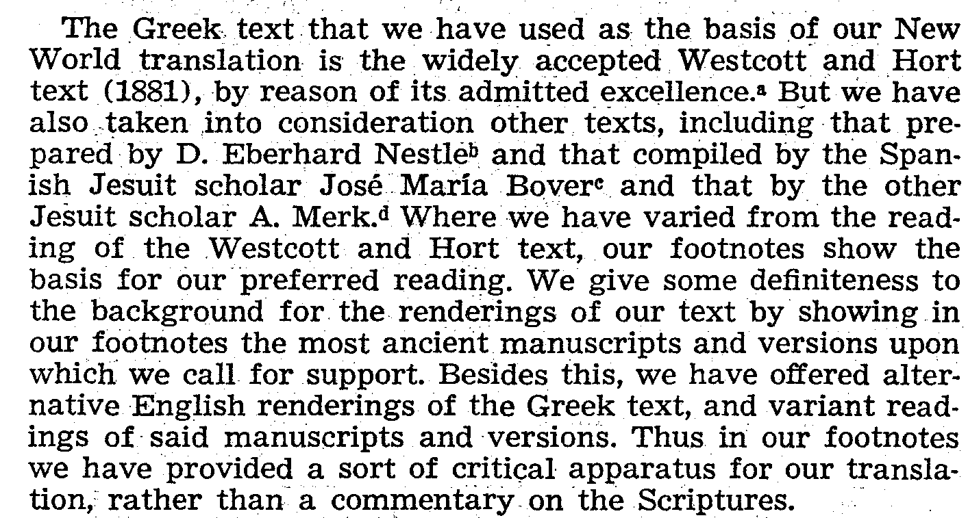 In the foreword, on page 9 we see the greek text that is the basis of the New World translation is the 1881 Westcott and Hort text (same as was used for the Revised Version of 1885, the ESV, ASV, NIV, etc ). They also use the Nestle’s greek text that is the text used by most all of the modern translations including NASB, NIV, HCSB, NET, RSV, TNIV, etc.